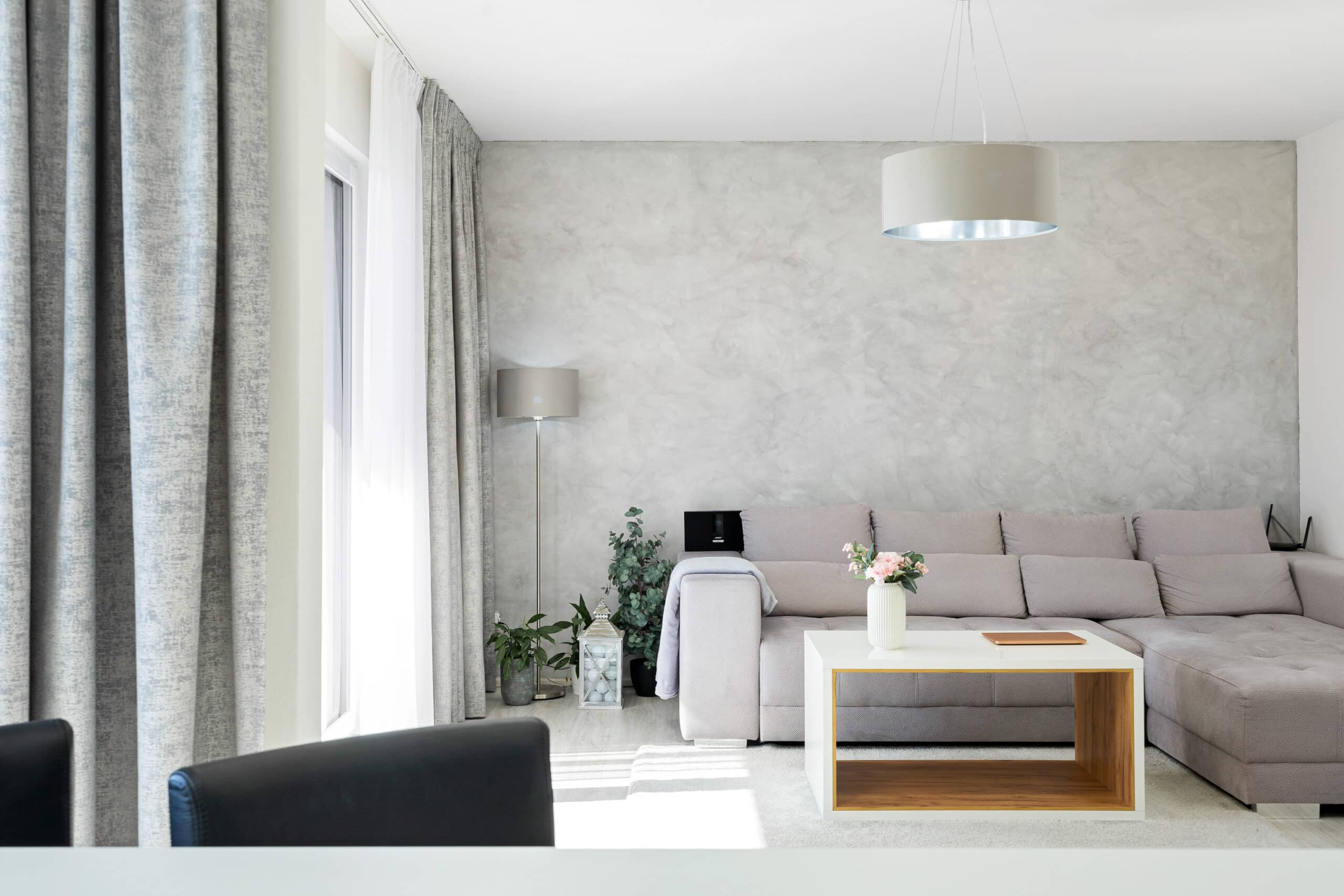 Interiér celého bytu se nese ve světlých barvách. Bílý lesk v kombinaci s dekorem dubu dodává bytu příjemnou atmosféru, pocit čistoty a zároveň tepla dřeva, což doplňuje i elektrický krb v obývacím pokoji.