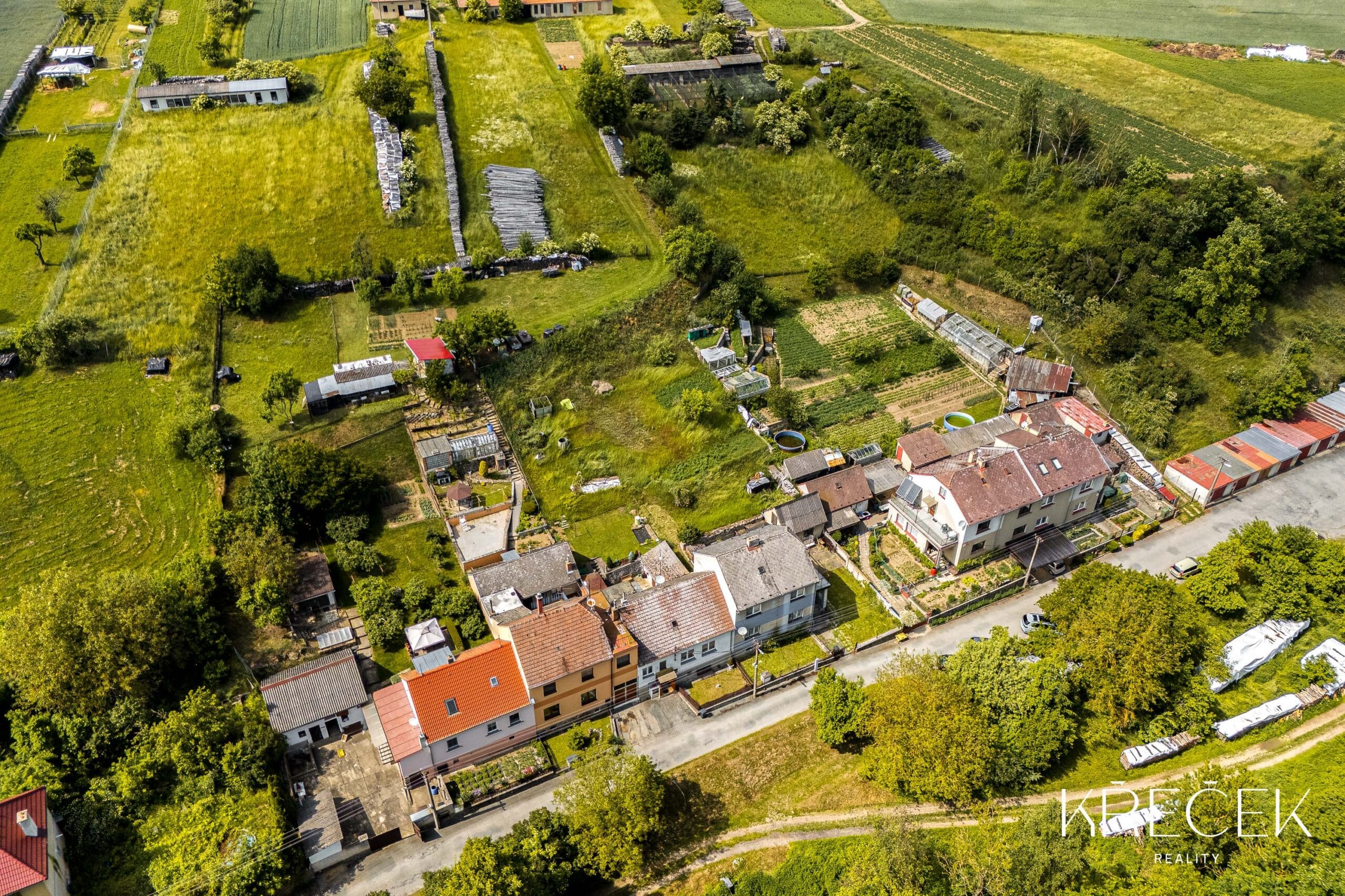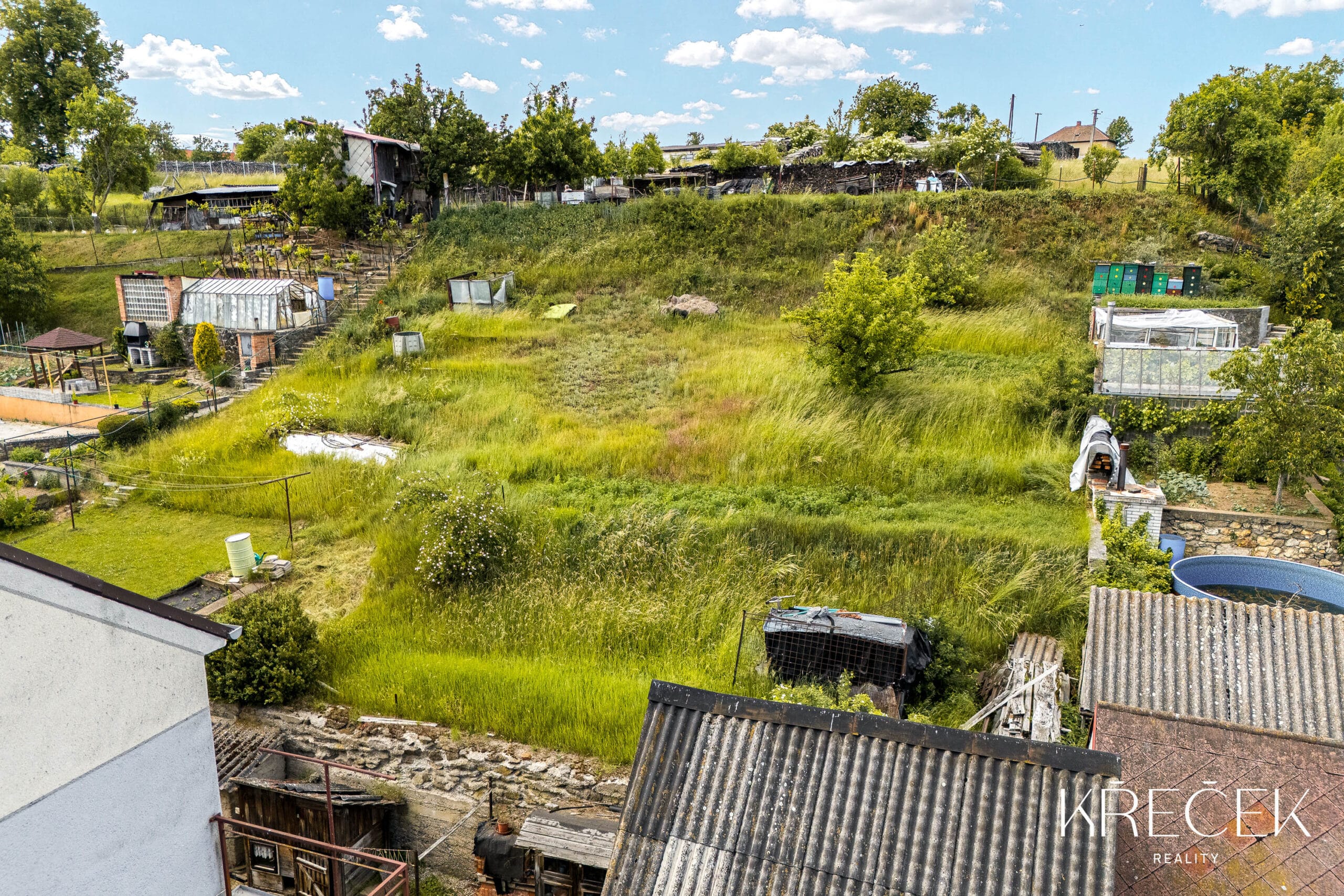 Zahrada je členěná do mírných kaskád a nabízí opravdu velkorysý prostor pro odpočinek, zahradničení, posezení i budoucí úpravy podle vašich představ. Nechybí ani praktické přístavky – kůlna a domek na nářadí.