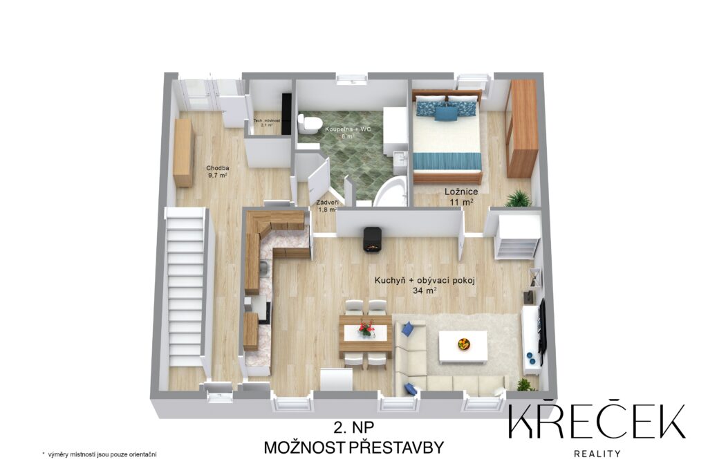 Následující vizualizace ukazují, jak by mohl dům vypadat po rekonstrukci. Každý prostor lze upravit a navrhnout přesně podle vašich představ a stylu.
