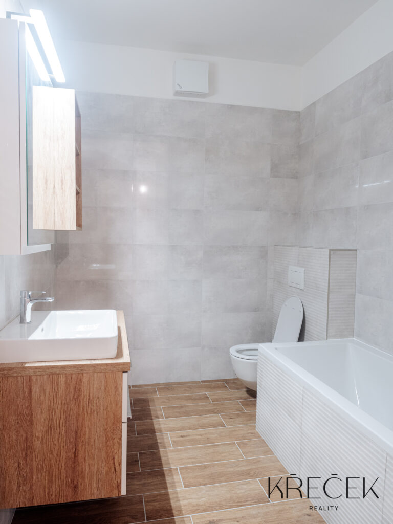 Moderní sanitární zařízení a kvalitními obklady zajišťují nejen funkčnost, ale i estetický dojem. Prostor je prakticky uspořádán, což umožňuje pohodlné využívání každodenních potřeb.
