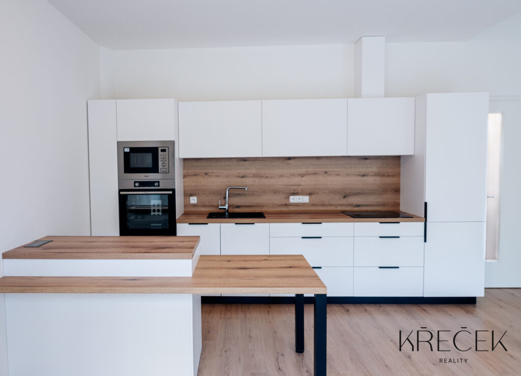 Byt je zařízen moderní kuchyňskou linkou, která byla navržena a vyrobena na míru, čímž maximálně využívá dostupný prostor. Velká hliníková francouzská okna zajišťují dostatek přirozeného světla, což byt opticky zútulňuje a prosvětluje. K celkovému dojmu prostornosti přispívají také vysoké stropy, které ještě více umocňují vzdušnou atmosféru a dělají z tohoto bytu ideální místo pro pohodlné a příjemné bydlení.